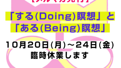 スタッフブログ 「する(Doing)瞑想」と「ある(Being)瞑想」 【 「する(Doing)瞑想」と「ある(Being)瞑想」 】■Facebookでフォローしている清水友邦さんが瞑想について解説しています。瞑想を「する(Doing)瞑想」と「ある(Being)瞑想」... 2025.10.16 スタッフブログ